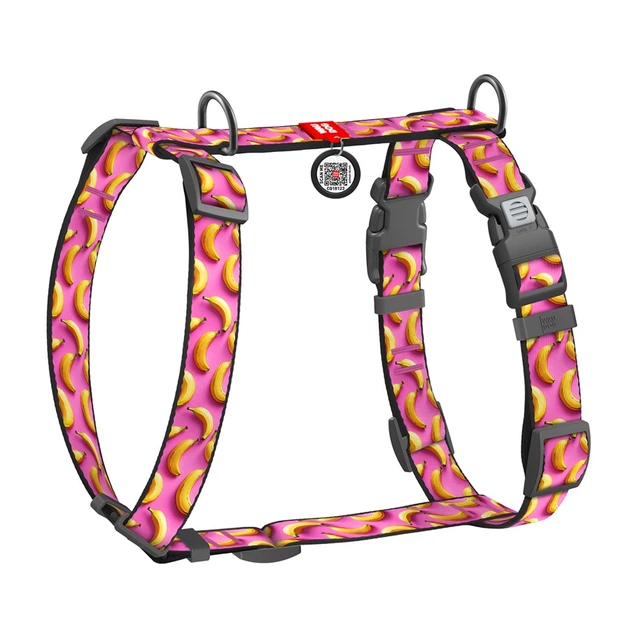Шлея для собак анатомічна H-подібна WAUDOG Nylon з QR-паспортом, малюнок "Банани на рожевому", пластиковий