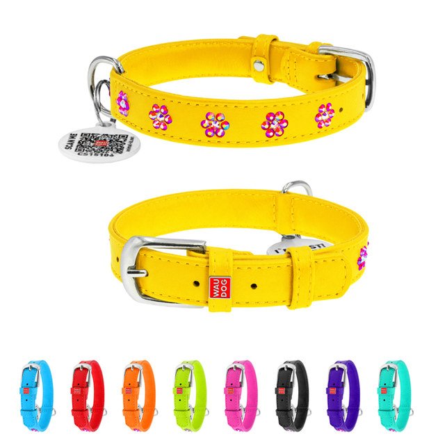 Нашийник для собак шкіряний WAUDOG Glamour з QR паспортом, з клейовими стразами Квіточка, Ш 20 мм, Д 30-39 см, жовтий