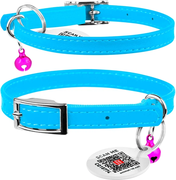 Нашийник для котів шкіряний WAUDOG Glamour з QR паспортом без прикрас XXS ширина 9 мм довжина 22-30 см Блакитний (32482)