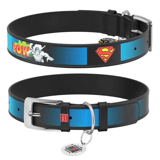 Шкіряний нашийник для собак WAUDOG Design з QR паспортом малюнок Супермен2 Ш 25 мм 37-48 см Black (0025-1008-01)