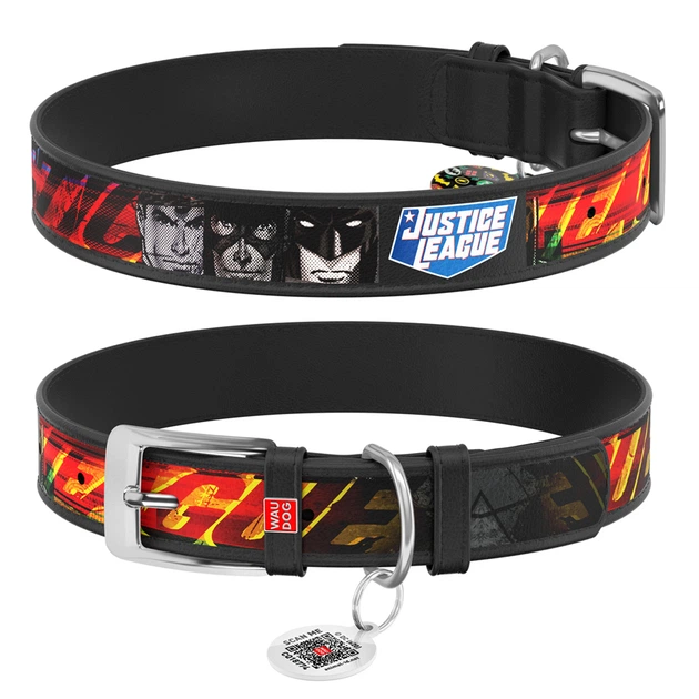 Нашийник для собак шкіряний WAUDOG Design з QR паспортом, малюнок "Ліга справедливості", Ш 25 мм, Дов 37-48 см чорний