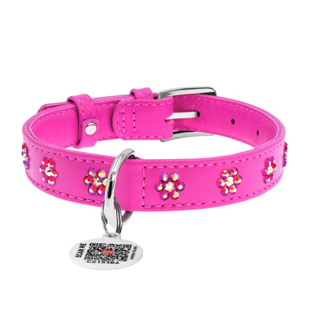 Шкіряний нашийник для собак WAUDOG Glamour з клейовими стразами Квіточка і QR паспортом Ш 15 мм Д 27-36 см Pink (32847)