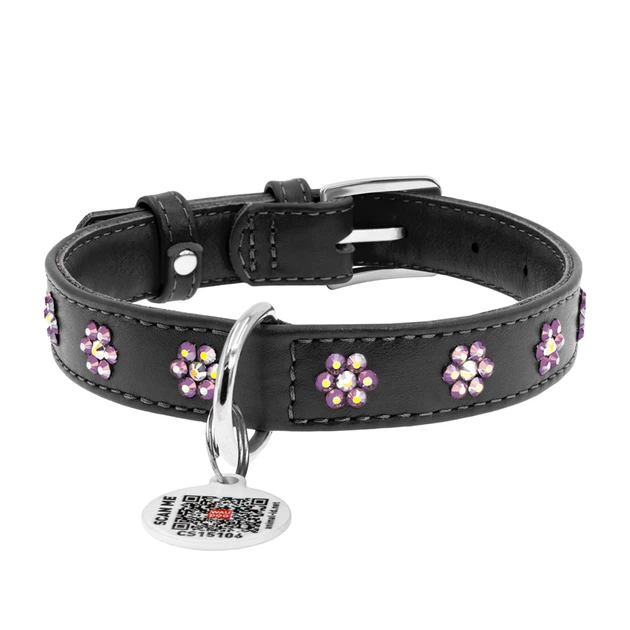 Шкіряний нашийник для собак WAUDOG Glamour з клейовими стразами Квіточка та QR паспортом Ш 15 мм Д 27-36 см Black (32841)
