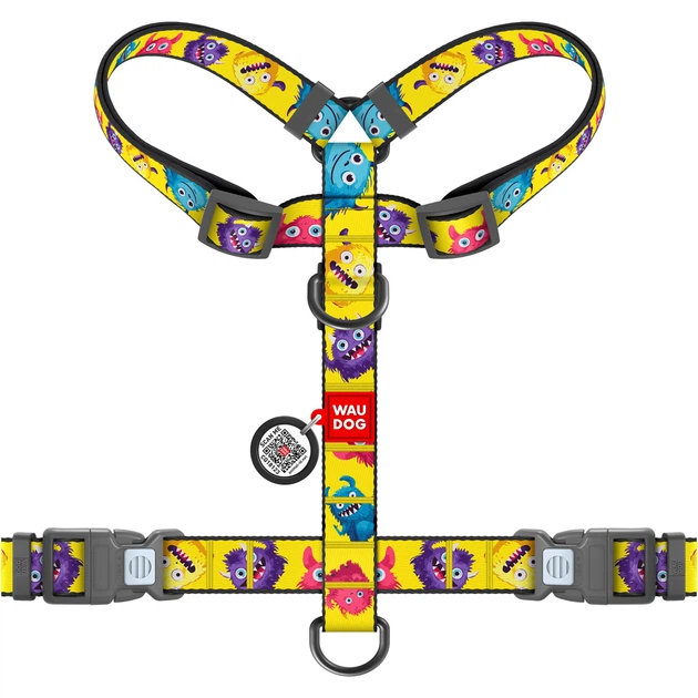 Шлея для собак анатомічна H-подібна WAUDOG Nylon з QR-паспортом, малюнок "Мохнаті монстри", з двома фастексами, розмір XL