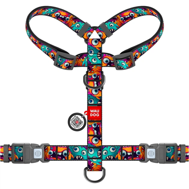 Шлея для собак анатомічна H-подібна WAUDOG Nylon з QR-паспортом, малюнок "Зубасті монстри", з двома фастексами, розмір XL