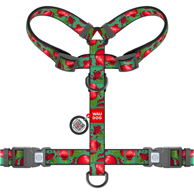 Шлея для собак анатомічна H-подібна WAUDOG Nylon з QR-паспортом, малюнок "Гранати", з двома фастексами, розмір XL