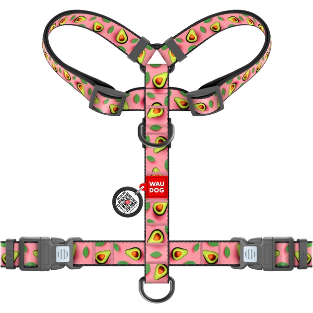 Шлея для собак анатомічна H-подібна WAUDOG Nylon з QR-паспортом, малюнок "Авокадо на рожевому", з двома фастексами, розмір X