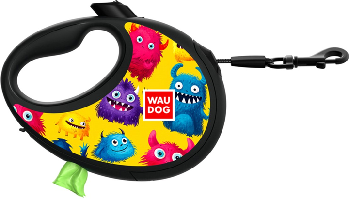Повідець-рулетка для собак WAUDOG R-leash з контейнером для пакетів, малюнок "Мохнаті монстри", світловідбивна стрічка, L, д