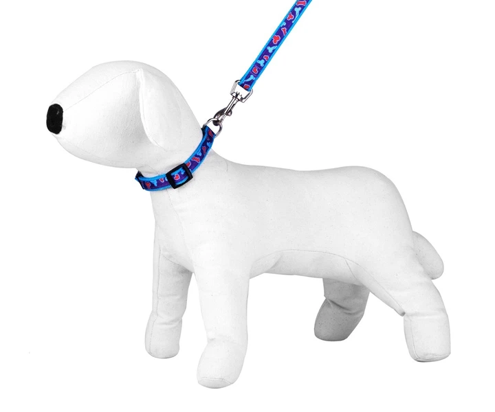 Набір - повідець і нашийник, ширина - 2 см, довжина - 120 см, нейлон, принт - серце/кістка, фіолетовий з червоно-синіми візе