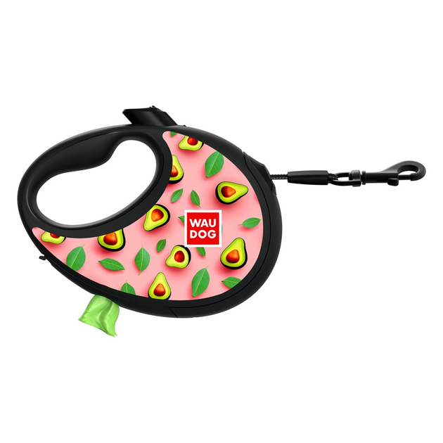 Повідець-рулетка для собак WAUDOG R-leash з контейнером для пакетів, малюнок "Авокадо на рожевому", світловідбивна стрічка,
