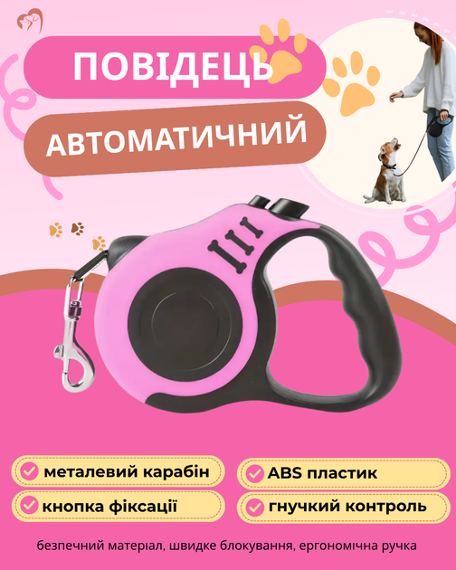 Повідець-рулетка для собак, 5 м, автоматичний із кнопкою фіксації — для дрібних/середніх порід
