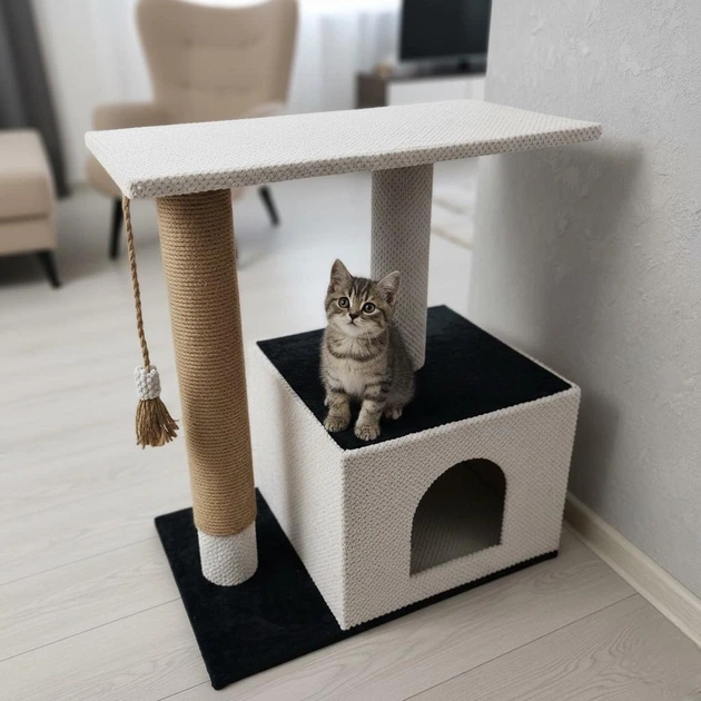 Будиночок коту зі стовпом кігтеточкою та лежанкою 60х40см молочно чорна