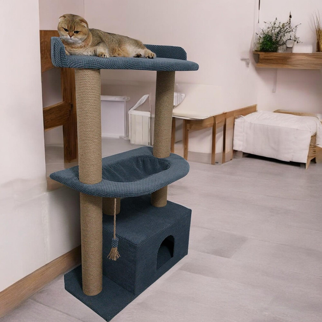Компактна кігтеточка лазалка для котиків всіх порід з будиночком гамаком 115х70х40см сіро-бежева