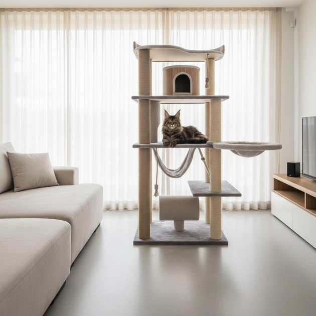Стильний комплекс кігтеточка в хб канаті Джулія 2 будиночок, велика лежанка, гамак для великих кішок, котів, розплідників 16