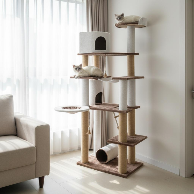 Ігровий котячий комплекс кігтеточка для розплідника притулку котиків 250х160х60см молочно-коричневий