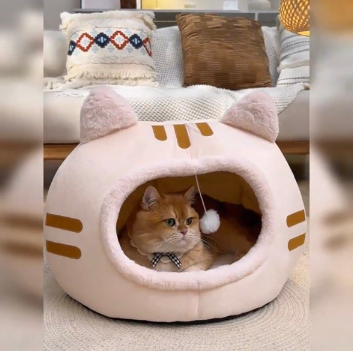 Будиночок лежанка для домашніх тварин кругла тепла зі знімною подушкою для котів та собак з іграшками, розмір M
