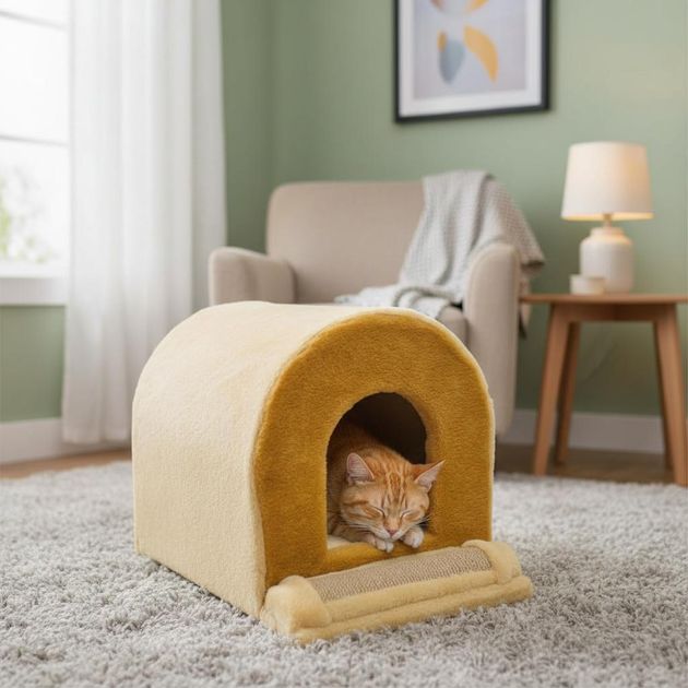 Когтеточка для кота з квадратним будиночком Пухнастик 72 * 36 * 36см бежевий з коричневим