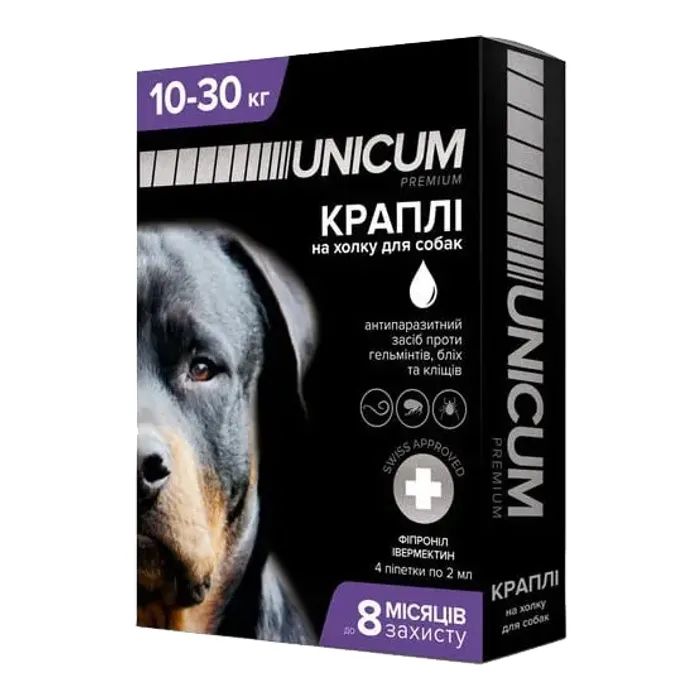 Краплі для тварин Unicum COMPLEX від бліх, кліщів та гельмінтів на холку для собак 10-30 кг/4 шт (4820150202521) 48201502025