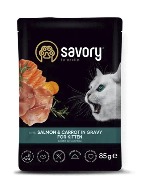 Вологий корм Savory Kitten для кошенят з лососем та морквою (шматочки в соусі) 85 г
