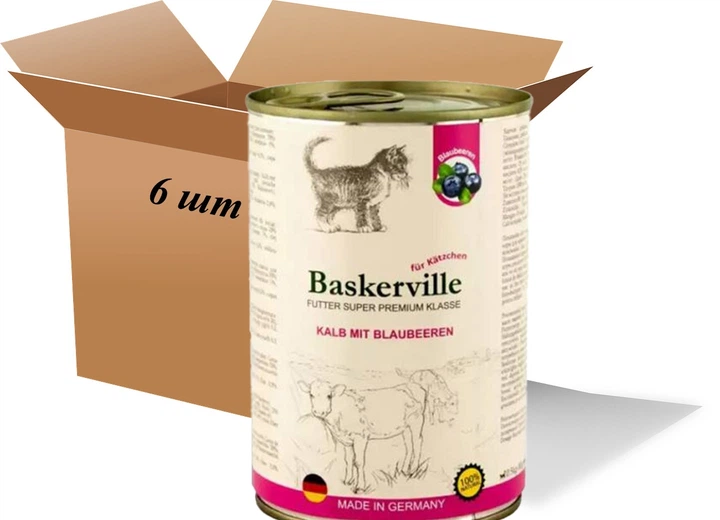 Вологий корм для котів Вaskerville, KF Super Premium Kalb Mit Blaubeeren Телятина з чорницею, 400 г (6 шт. Упаковка)