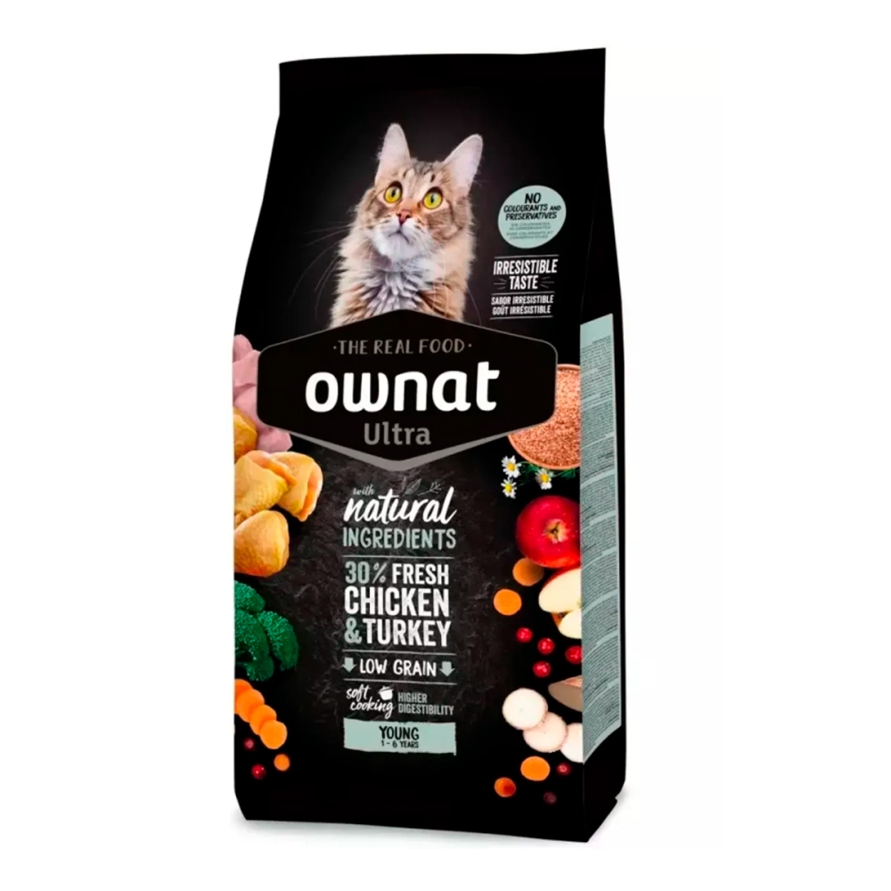 Ownat Ultra Cat Chicken — це повнораціонний сухий корм суперпреміум класу, створений спеціально для дорослих котів віком до 6 років, а також для кішок у період вагітності та лактації. Його рецептура з 30% свіжого м’яса курки та індички забезпечує чудовий смак і повноцінне задоволення всіх харчових потреб дорослого кота з нормальним рівнем активності, незалежно від породи та розміру.
