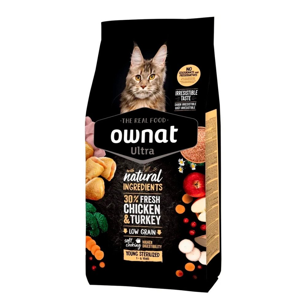 Ownat Ultra Cat Sterilised — це повнораціонний сухий корм суперпреміум класу, спеціально розроблений для дорослих стерилізованих котів віком до шести років. Завдяки зниженому вмісту жиру та підвищеному рівню клітковини корм допомагає контролювати вагу та підтримувати відчуття ситості. Формула з 30% свіжого м’яса курки та індички забезпечує оптимальну кількість білка для підтримання м’язової маси та загального здоров’я кішки.
