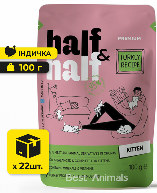Вологий корм для кошенят з індичкою Half&Half шматочки в желе пауч 100 г 22 шт (4820261920864)