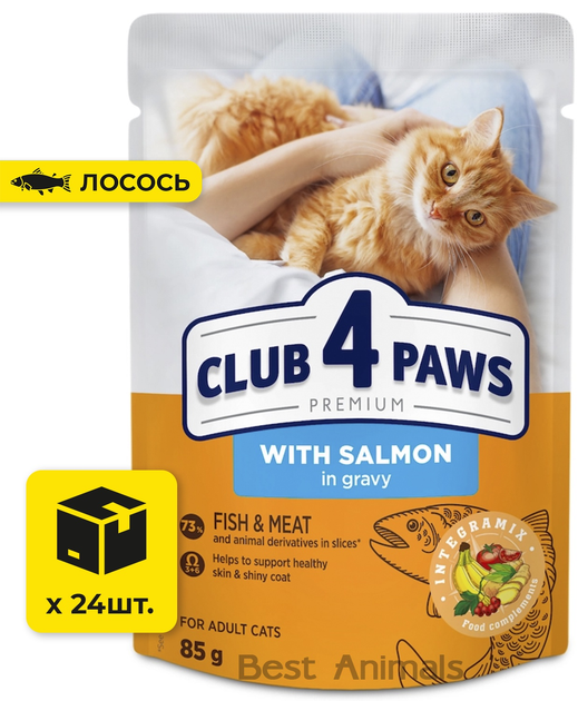 Вологий корм для котів Club 4 Paws Клуб 4 Лапи з лососем в соусі пауч 85 г 24 шт (4820269143616)
