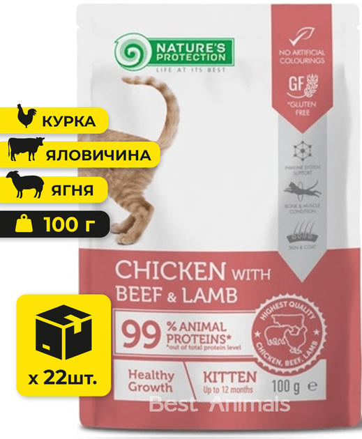 Вологий корм з куркою яловичиною та ягням котів Nature's Protection Натюр Протекшн для кошенят пауч 100 г 22 шт (47790516365