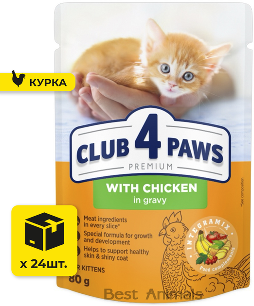 Вологий корм з куркою в соусі Club 4 Paws Клуб 4 Лапи для кошенят пауч 80 г 24 шт (4820083908927)