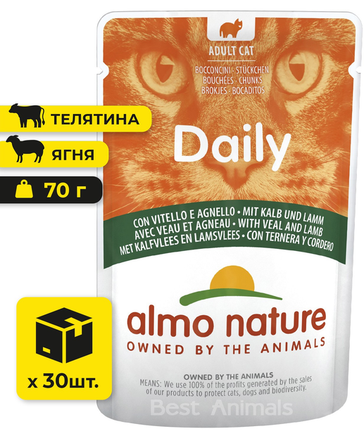 Вологий корм для котів з телятиною та ягням Almo Nature Альмо Натюр шматочки в желе пауч 70 г 30 шт (8001154125856)