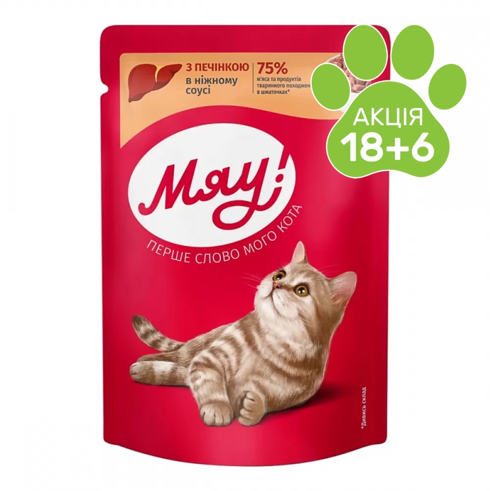 Мяу! (пауч) Консервований корм для кішок з печінкою в ніжному соусі 18+6 × 85 гр