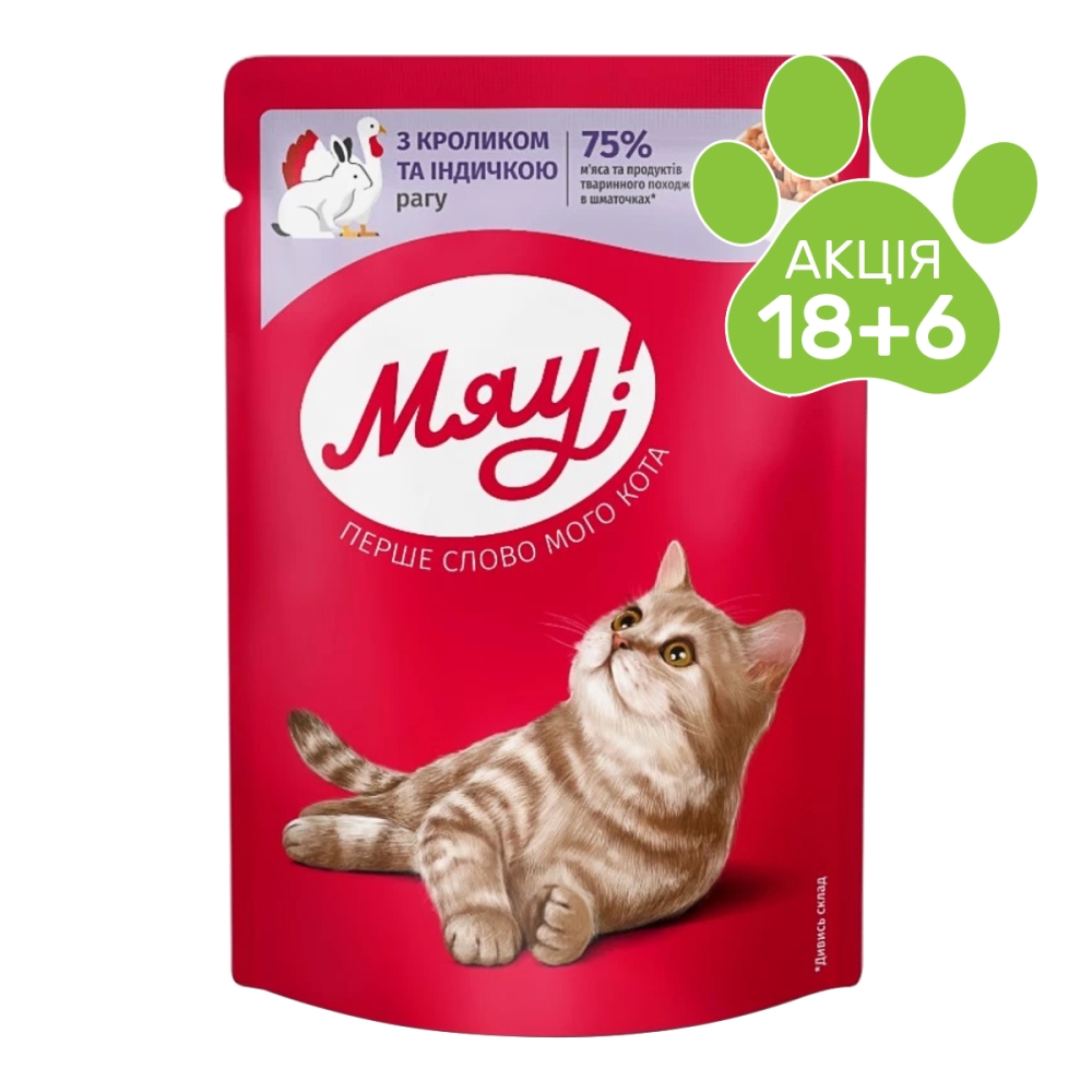 Мяу! (пауч) Консервований корм для кішок рагу з кроликом та індичкою 18+6 × 85 гр