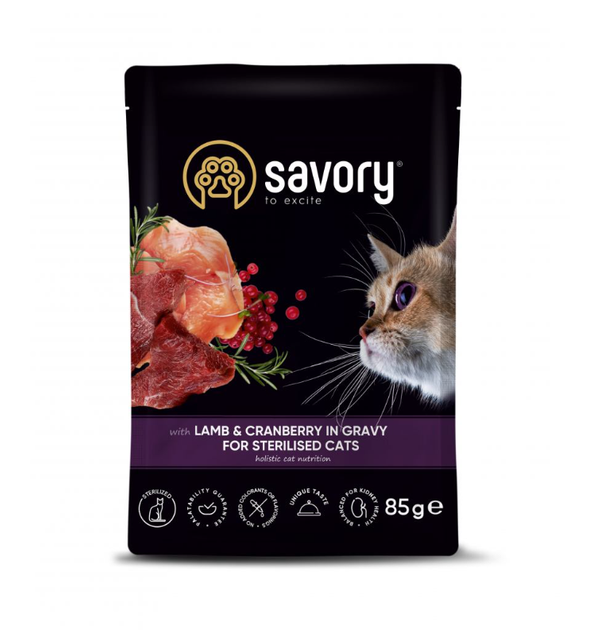 Вологий корм Savory для стерилізованих кішок, ягня з журавлиною в соусі, пауч, 85 г