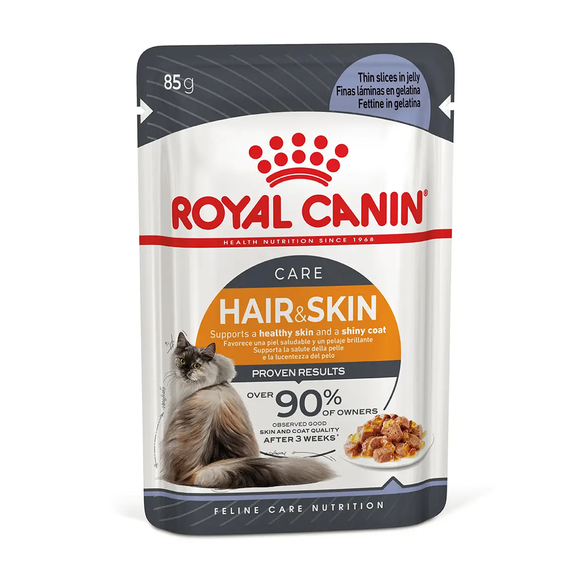 Повнорацiонний вологий корм (шматочки в желе) для дорослих котів віком від 12 місяців, рекомендований для підтримання здоров’я шкіри та блиску шерсті. ДОВЕДЕНА ЕФЕКТИВНІСТЬ Понад 90% власників котів відзначили хорошу якість шкіри та шерсті після 3 тижнів годування сухими та вологими раціонами ROYAL CANIN® HAIR & SKIN CARE. *Внутрішнє дослідження Royal Canin Раціон розроблений, щоб