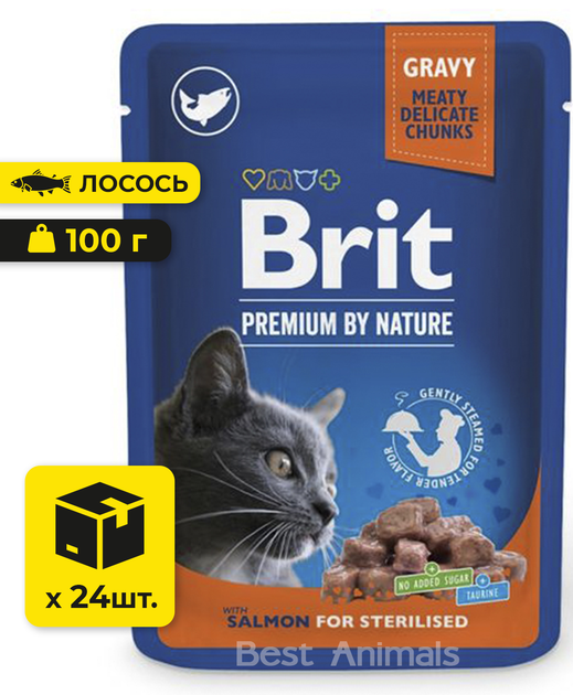 Вологий корм Brit Premium Sterilised для стерилізованих кішок з лососем (шматочки у соусі) 100 г х 24 шт