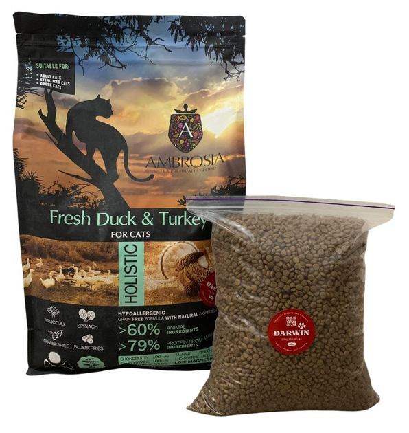 Беззерновий корм Ambrosia Grain free зі свіжою качкою та індичкою для літніх та стерилізованих кішок 2кг (власне фасування)