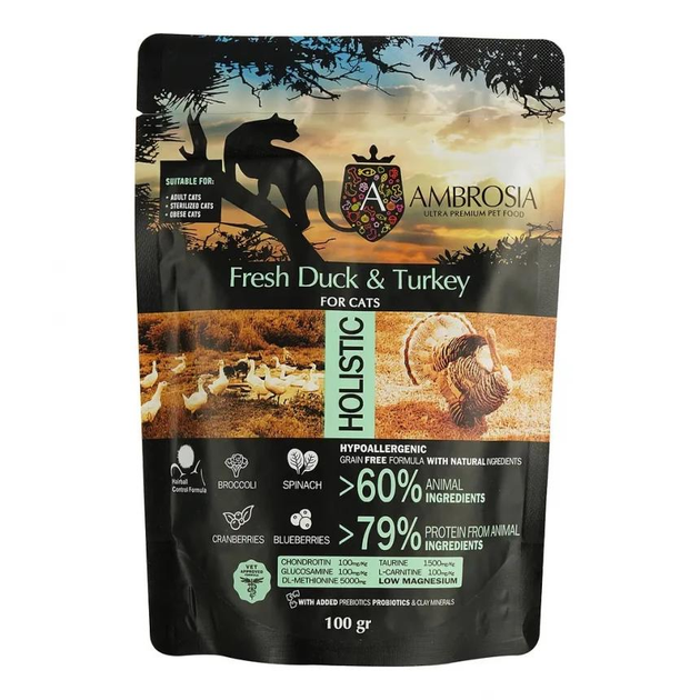 Беззерновий корм Ambrosia Grain free зі свіжою качкою та індичкою для літніх та стерилізованих кішок 0,1кг (5214002707460)