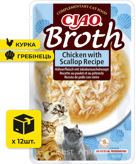 Вологий корм для котів INABA CIAO Broth з куркою та морським гребінцем в бульйоні пауч 40 г 12 шт (4262365738271)