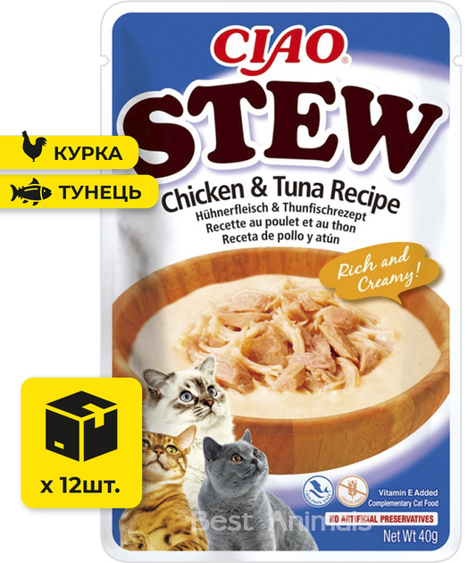 Вологий корм для котів INABA CIAO Stew соус пюре з шматочками курки та тунцям пауч 40 г 12 шт (4262365738417)