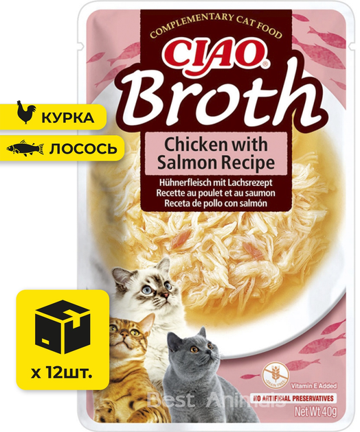Вологий корм для котів INABA CIAO Broth з куркою та лососем в бульйоні пауч 40 г 12 шт (4262365738288)