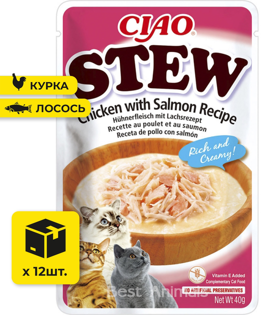 Вологий корм для котів INABA CIAO Stew соус пюре з шматочками курки та лосося пауч 40 г 12 шт (4262365738431)