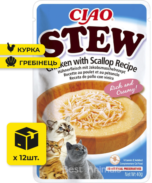 Вологий корм для котів INABA CIAO Stew соус пюре з шматочками курки та морського гребінця пауч 40 г 12 шт (4262365738448)