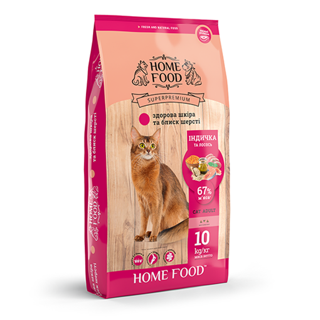 Сухий корм для дорослих кішок Home Food CAT ADULT Здорова шкіра та блиск шерсті з індичкою та лососем 10 кг