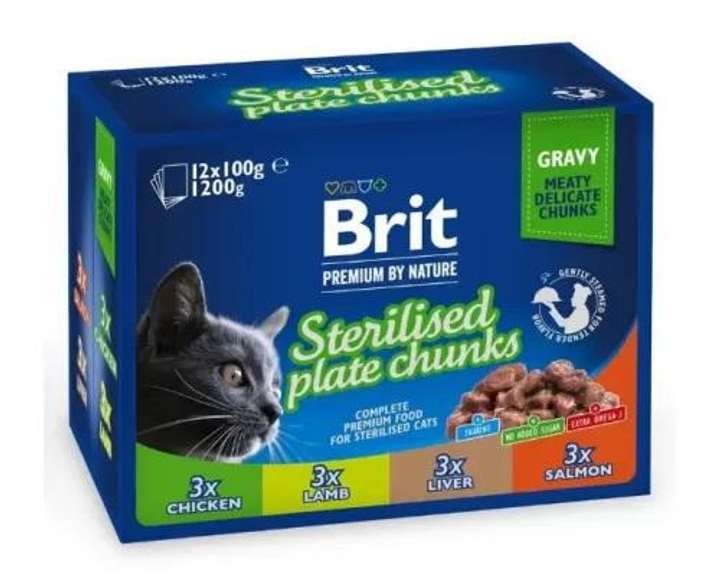 Упаковка вологого корму для стерилізованих котів Brit Premium Сімейна тарілка асорті (12 шт. х 100 г)