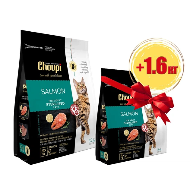 Набір Сухий корм Choupi - для стерилізованих котів, з лососем 3.2 кг + 1.6 кг