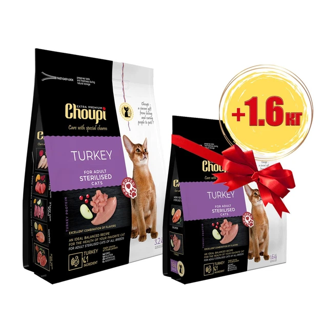 Набір Сухий корм Choupi - для стерилізованих котів, з індичкою 3.2 кг + 1.6 кг