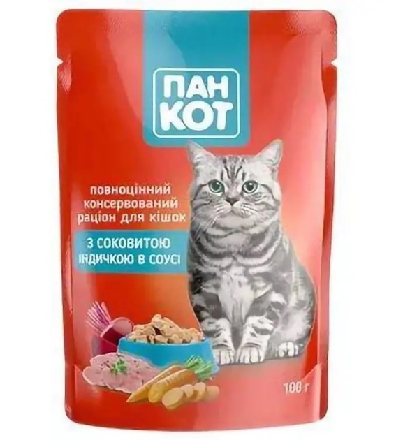 Вологий корм для котів Пан Кіт паучі (З соковитою індичкою в соусі) 12х100г