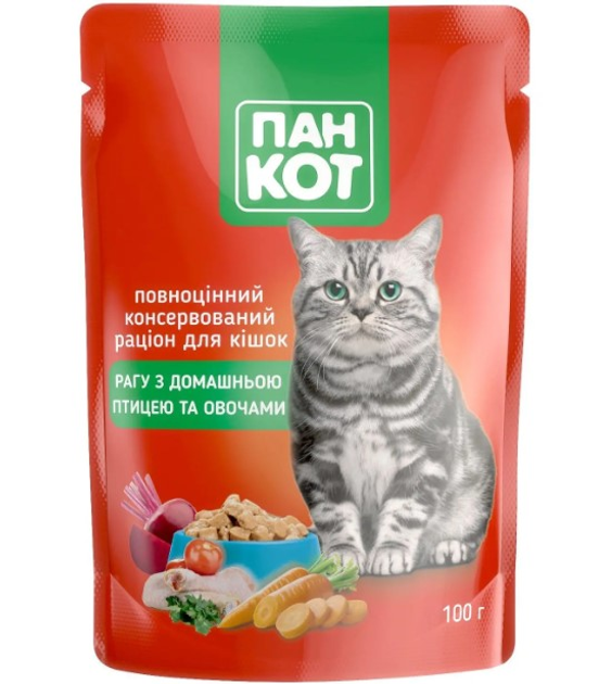 Вологий корм для котів Пан Кіт паучі (Рагу з домашньою птицею та овощами) 12х100г