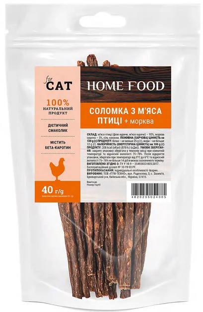 Ласощі для кішок Home Food Соломка з м'яса птиці+морква For CAT 40г (4820235024005)
